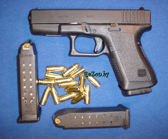 Для зарядки магазина пневматического пистолета Daisy 5501 (Глок 19), необходимо зафиксировать пружину подавателя, после чего установить (по желанию) пластиковую крышку, предотвращающую выброс шариков. Пули ВВ 4.5 заряжается не через верх обоймы, а через отверстие в ее середине. Фото внизу - Глок 19 серии 9 мм.